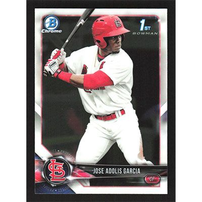 This is a 2018 Bowman Chrome Prospects Jose Adolis Garcia baseball card. The card is #BCP121 and pictures show condition.