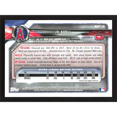 This is a 2018 Bowman Chrome Prospects Jo Adell autographed baseball card. This card has been signed, in blue, by Jo Adell, and is guaranteed authentic by Ballcardz.com. The card is #BCP136 and pictures show condition.