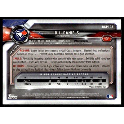 This is a 2018 Bowman Chrome Prospects D.J. Daniels baseball card. The card is #BCP193 and pictures show condition.