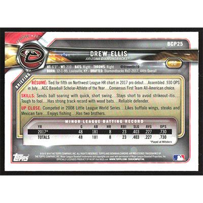 This is a 2018 Bowman Chrome Prospects Drew Ellis baseball card. The card is #BCP25 and pictures show condition.