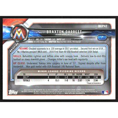 This is a 2018 Bowman Chrome Prospects Braxton Garrett baseball card. The card is #BCP42 and pictures show condition.