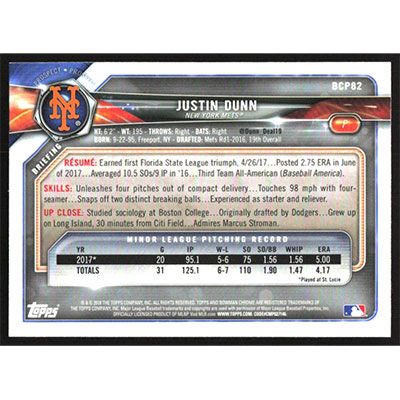 This is a 2018 Bowman Chrome Prospects Justin Dunn baseball card. The card is #BCP82 and pictures show condition.