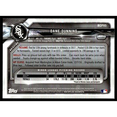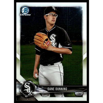 This is a 2018 Bowman Chrome Prospects Dane Dunning baseball card. The card is #BCP85 and pictures show condition.