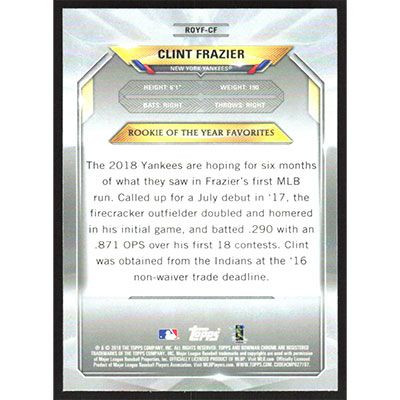 This is a 2018 Bowman Chrome Rookie of the Year Favorites Refractors Clint Frazier baseball card. The card is #ROYF-CF and pictures show condition. Team(s): New York Yankees Rookie Card (RC)
