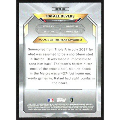 This is a 2018 Bowman Chrome Rookie of the Year Favorites Refractors Rafael Devers baseball card. The card is #ROYF-RD and pictures show condition. Team(s): Boston Red Sox Rookie Card (RC)