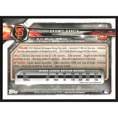 This is a 2018 Bowman Prospects Aramis Garcia baseball card. The card is #BP112 and pictures show condition.