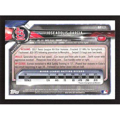 This is a 2018 Bowman Prospects Jose Adolis Garcia baseball card. The card is #BP121 and pictures show condition.