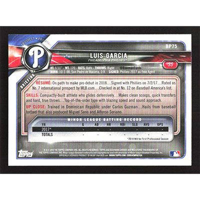 This is a 2018 Bowman Prospects Luis Garcia baseball card. The card is #BP75 and pictures show condition.