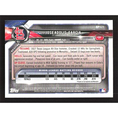 This is a 2018 Bowman Prospects Camo Jose Adolis Garcia baseball card. The card is #BP121 and pictures show condition.