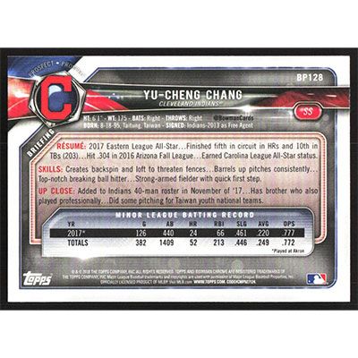 This is a 2018 Bowman Prospects Camo Yu-Cheng Chang baseball card. The card is #BP128 and pictures show condition.