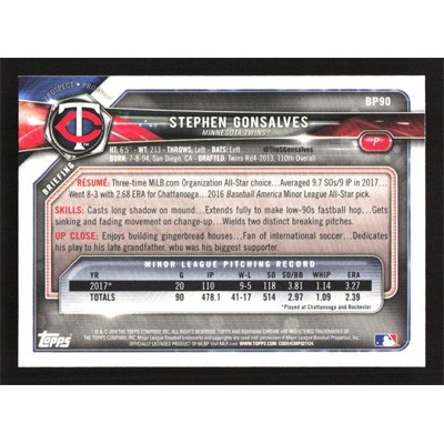 This is a 2018 Bowman Prospects Camo Stephen Gonsalves baseball card. The card is #BP90 and pictures show condition.