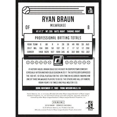 This is a 2018 Donruss Ryan Braun baseball card. The card is #136 and pictures show condition.