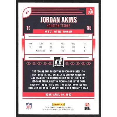 This is a 2018 Donruss Jordan Akins football card. The card is #388 and pictures show condition.