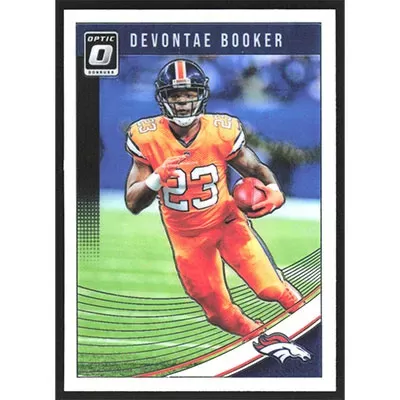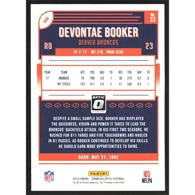 This is a 2018 Donruss Optic Devontae Booker football card. The card is #33 and pictures show condition.