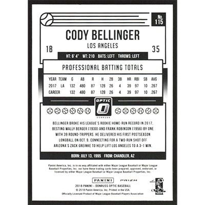 This is a 2018 Donruss Optic Holo Cody Bellinger baseball card. The card is #115 and pictures show condition.