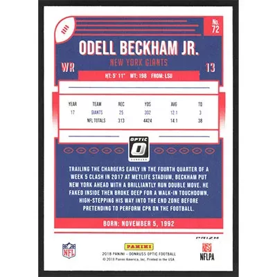 This is a 2018 Donruss Optic Holo Odell Beckham Jr. football card. The card is #72 and pictures show condition.