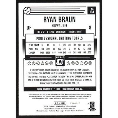 This is a 2018 Donruss Optic Pink Ryan Braun baseball card. The card is #104 and pictures show condition.
