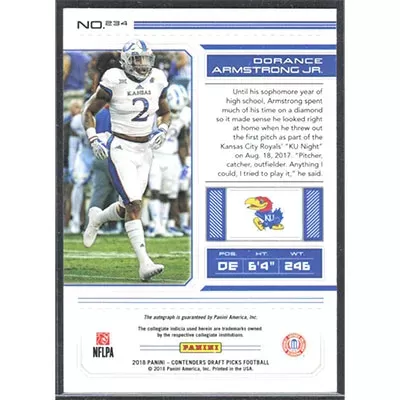 This is a 2018 Panini Contenders Draft Picks Dorance Armstrong Jr. autographed football card. This card has been signed, in blue, by Dorance Armstrong Jr., and is guaranteed authentic by Ballcardz.com. The card is #234 and pictures show condition.