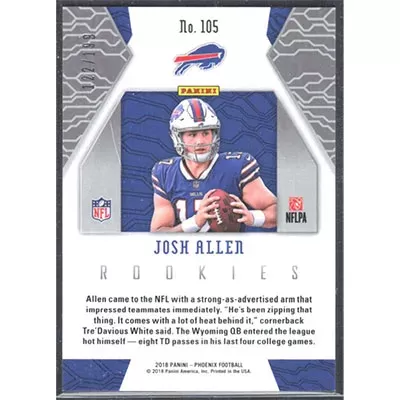 This is a 2018 Panini Phoenix Pink Josh Allen football card. The card is #105 and pictures show condition. This card is limited; #'d 122/199. Team: Buffalo Bills Rookie Card