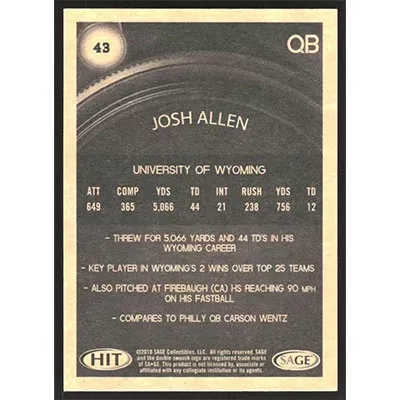 This is a 2018 SAGE HIT Josh Allen In Focus football card. The card is #43 and pictures show condition.