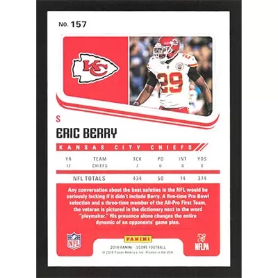 This is a 2018 Score Eric Berry autographed football card. This card has been signed, in blue, by Eric Berry, and is guaranteed authentic by Ballcardz.com. The card is #157 and pictures show condition.