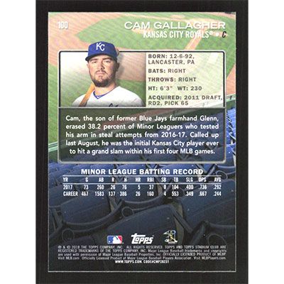 This is a 2018 Stadium Club Cam Gallagher baseball card. The card is #100 and pictures show condition. Team(s): Kansas City Royals Rookie Card (RC)