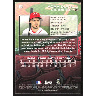 This is a 2018 Stadium Club Adam Duvall baseball card. The card is #243 and pictures show condition.
