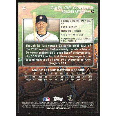 This is a 2018 Stadium Club Carlos Correa baseball card. The card is #32 and pictures show condition.