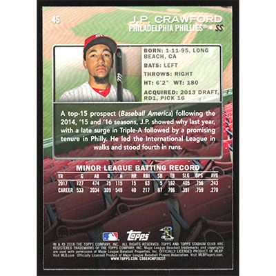 This is a 2018 Stadium Club J.P. Crawford baseball card. The card is #45 and pictures show condition. Team(s): Philadelphia Phillies Rookie Card (RC)