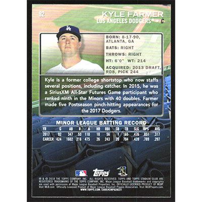This is a 2018 Stadium Club Kyle Farmer autographed baseball card. This card has been signed, in blue, by Kyle Farmer, and is guaranteed authentic by Ballcardz.com. The card is #92 and pictures show condition.