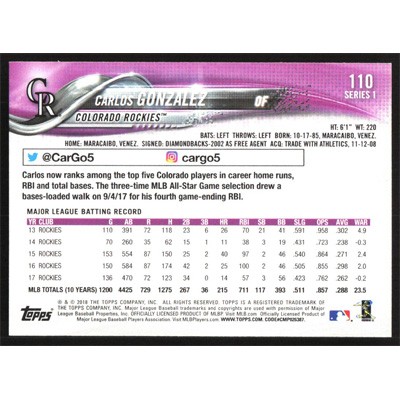 This is a 2018 Topps Carlos Gonzalez baseball card. The card is #110 and pictures show condition.