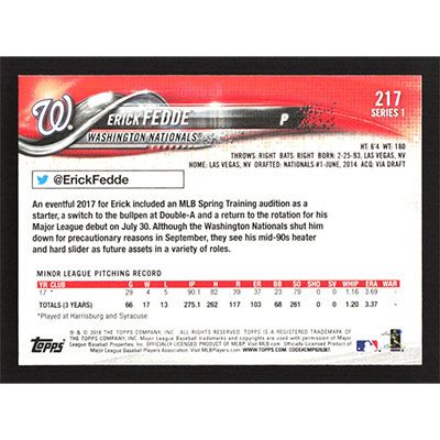 This is a 2018 Topps Erick Fedde autographed baseball card. This card has been signed, in blue, by Erick Fedde, and is guaranteed authentic by Ballcardz.com. The card is #217 and pictures show condition.