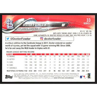 This is a 2018 Topps Dexter Fowler baseball card. The card is #33 and pictures show condition.