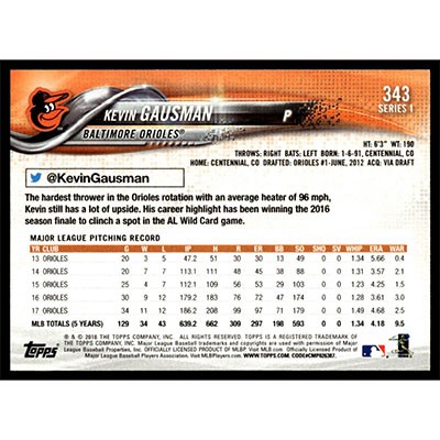 This is a 2018 Topps Kevin Gausman baseball card. The card is #343 and pictures show condition.