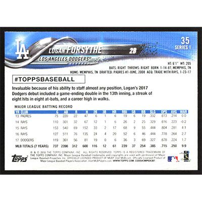 This is a 2018 Topps Logan Forsythe baseball card. The card is #35 and pictures show condition.