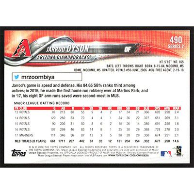 This is a 2018 Topps Jarrod Dyson baseball card. The card is #490 and pictures show condition.