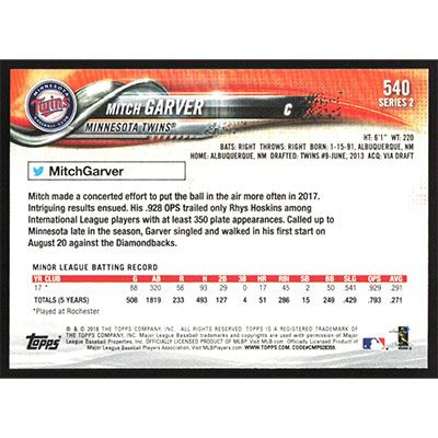 This is a 2018 Topps Mitch Garver baseball card. The card is #540 and pictures show condition.