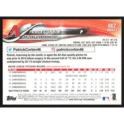 This is a 2018 Topps Patrick Corbin baseball card. The card is #662 and pictures show condition.
