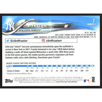 This is a 2018 Topps Clint Frazier autographed baseball card. This card has been signed, in blue, by Clint Frazier, and is guaranteed authentic by Ballcardz.com. The card is #7 and pictures show condition.