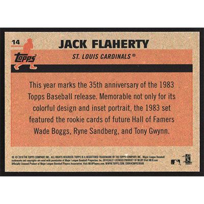 This is a 2018 Topps '83 Silver Pack Chrome Jack Flaherty baseball card. The card is #14 and pictures show condition. Team(s): St. Louis Cardinals Rookie Card (RC)