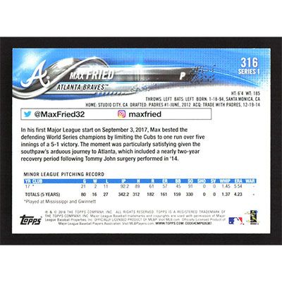 This is a 2018 Topps All-Star Game Silver Max Fried baseball card. The card is #316 and pictures show condition. Team(s): Atlanta Braves Rookie Card (RC)