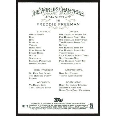This is a 2018 Topps Allen & Ginter Freddie Freeman baseball card. The card is #191 and pictures show condition.