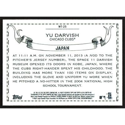 This is a 2018 Topps Allen & Ginter World Talent Yu Darvish baseball card. The card is #WT-25 and pictures show condition.