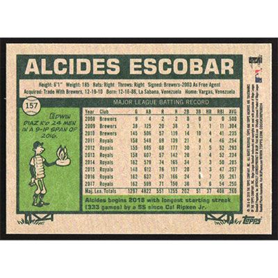 This is a 2018 Topps Archives Alcides Escobar baseball card. The card is #157 and pictures show condition.