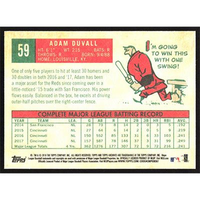 This is a 2018 Topps Archives Adam Duvall baseball card. The card is #59 and pictures show condition.