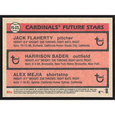 This is a 2018 Topps Archives '81 Future Stars Jack Flaherty, Harrison Bader and Alex Mejia baseball card. The card is #FS-STL and pictures show condition.