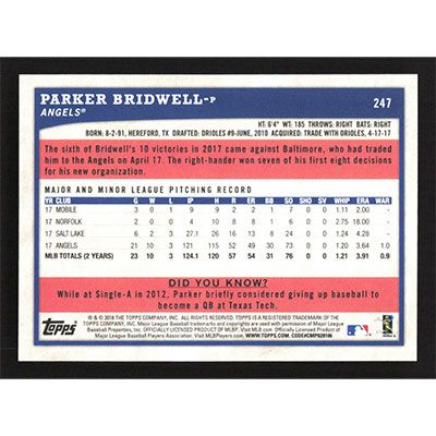 This is a 2018 Topps Big League Parker Bridwell baseball card. The card is #247 and pictures show condition. Team(s): Los Angeles Angels Rookie Card (RC)