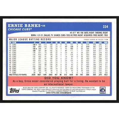 This is a 2018 Topps Big League Ernie Banks baseball card. The card is #334 and pictures show condition.