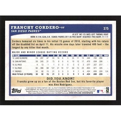 This is a 2018 Topps Big League Franchy Cordero baseball card. The card is #375 and pictures show condition. Team(s): San Diego Padres Rookie Card (RC)
