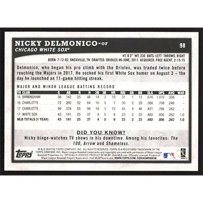 This is a 2018 Topps Big League Nicky Delmonico baseball card. The card is #98 and pictures show condition. Team(s): Chicago White Sox Rookie Card (RC)